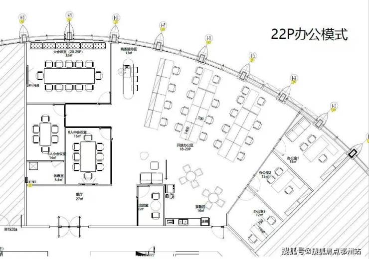 格局:18工位+4会议室+3办公室,有茶水间(最多容纳56人)