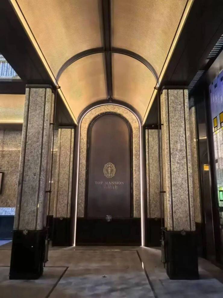 而在上层,则采用了上海海鸥丽晶酒店同款立面石材——巴西金;大门的门扇部位以高超的陶瓷镶嵌铜丝工艺,配纯手工掐丝珐琅贴片的精制拼贴。
