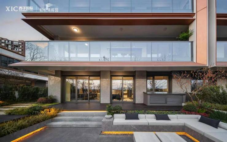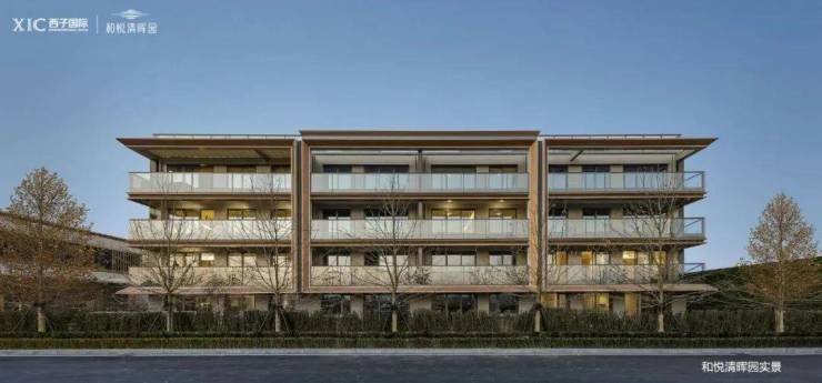 为此和悦清晖园特意请来了绿城六和建筑设计(GLA)负责建筑设计,以大面积玻璃幕墙为基底,辅以斜切45度角的玫瑰金边框勾勒,加上几乎与建筑同宽的玻璃栏杆,让和悦清晖园的立面营造出精致、利落的简约风格。