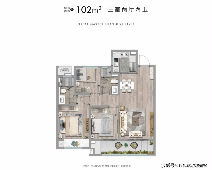 其中, 建面约102㎡精装高层户型,做了三房两厅两卫设计,功能齐全。