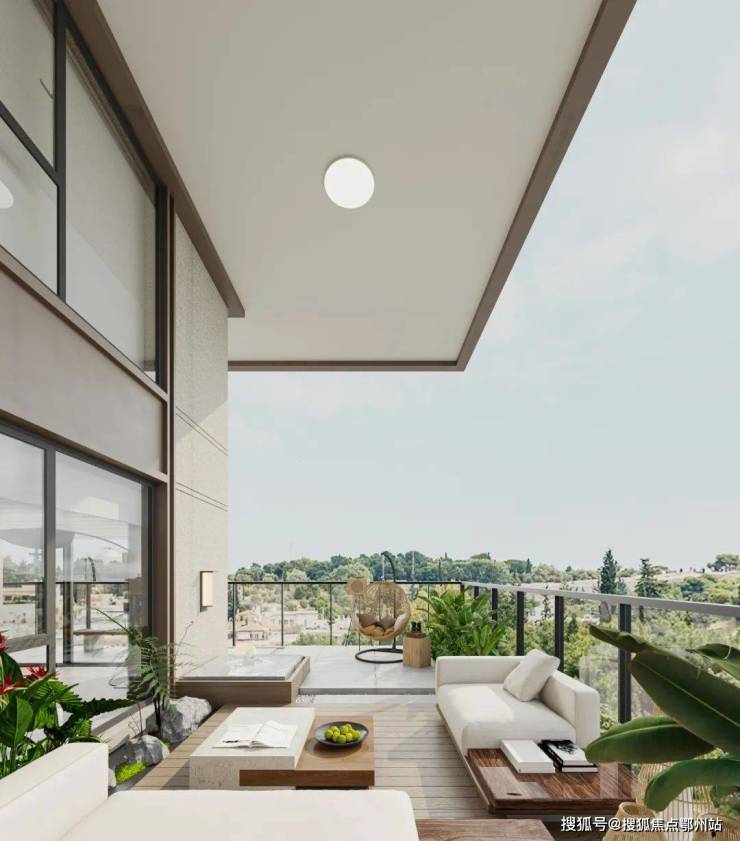 空中庭院的存在,让业主拥有大量半室外空间,大大提升了人与自然、阳光的交互性,也提升了居住空间的舒适性。在空中庭院,莳花、弄草、养鸟、观鱼,享受田园情趣,沐浴阳光温暖 ,充满“松弛感”与“度假感”的舒缓惬意。