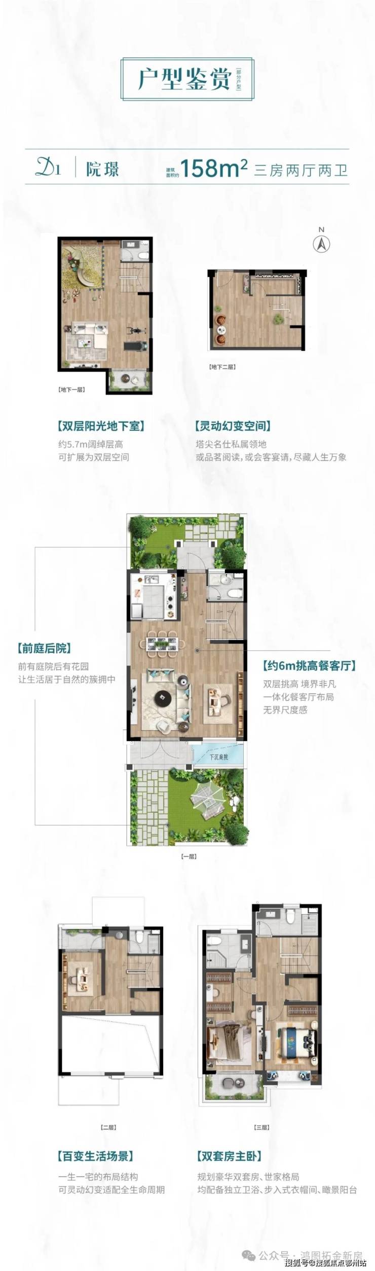 建面约150-160㎡别墅,规划3F联排别墅+5F臻品叠墅产品,院落墅居、星级套房、地下室等满足都市家庭对于墅居的所有美好想象。