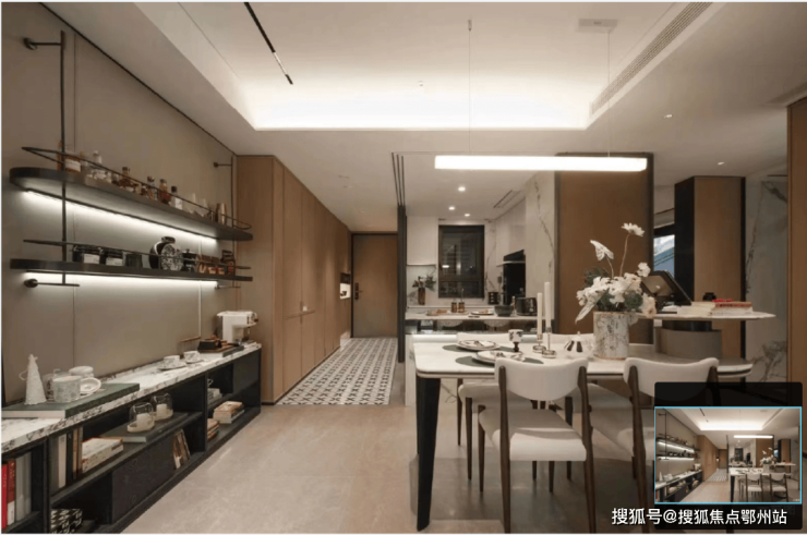 其中,餐厨系统的进阶不只在于橱柜、拉蓝等细节的收纳,更在于映江润府引入创新的S墙,可以轻松将冰箱移出厨房,同时保证视觉效果的整体性。