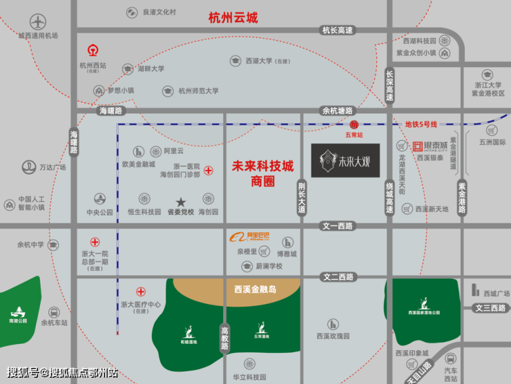 项目属于未来科技城板块,处于同顺街与邱桥路交叉口东侧。小区的隔壁就是同花顺大楼(杭州同花顺数据开发有限公司),项目离地铁 5 号线口(五常站)近 300 米,从萧山到老余杭的,和 2.3.4 号线都能直接换乘。
