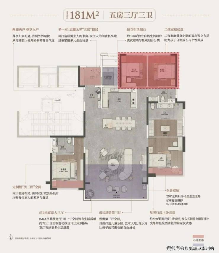 建面约181㎡户型的一大卖点还在于“4+1”房的高度定制化。宝贵的“+1”房,让主人可以摆脱在卧室或客厅角落“挤”出兴趣空间的窘迫, 拥有一处完全独立、私密、安放志趣的领地,可打造男主人的书房、雪茄吧,女主人的闺蜜下午茶厅,家庭影音室、威士忌吧、红酒收藏室。 让“爸爸”、“妈妈”在家庭角色之外,依然能完整地做回“自己”,安放那些让灵魂雀跃的爱好与情绪。