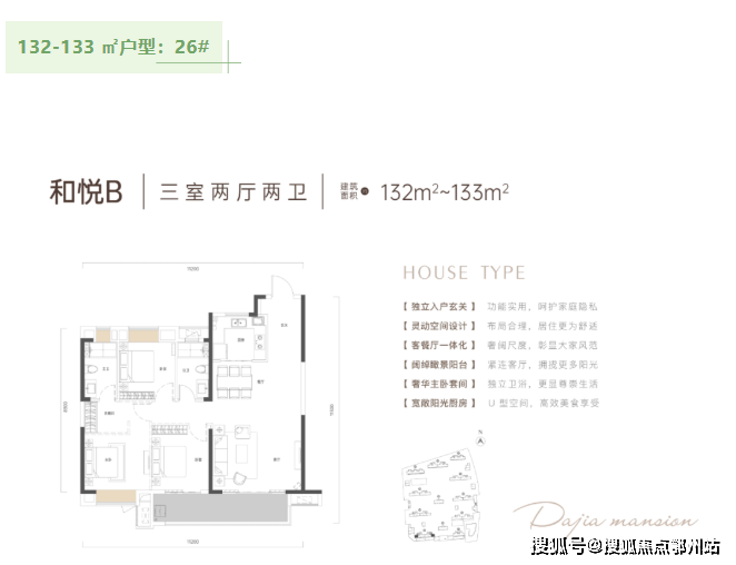 三开间朝南,南向面宽和进深会更大,开间接近10米;动静分区,公区一体化设计,客厅与南向次卧没有承重墙的限制,改造性更强,也可做大横厅;全屋三飘窗+大阳台,更多的可拓空间,更高得房率,主卧套房,自带步入式衣帽间和独立卫生间。
