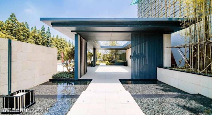 金地提倡“家的品质,从社区的入口开始”,在西门出入口,有雅致气派的门廊,走进来有仪式感较强的山水意韵景墙,材料上石材与金属相碰撞,相得益彰。