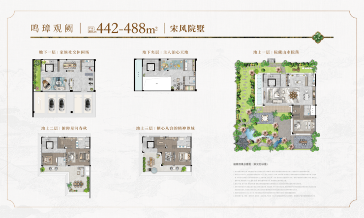 在合院产品中,开创性引入 “一宅六院” 设计,构建出地下挑高光院、南向诗意庭院、北向入户礼院、二层观景静院、三层巨幕心院、三层露台星院。
