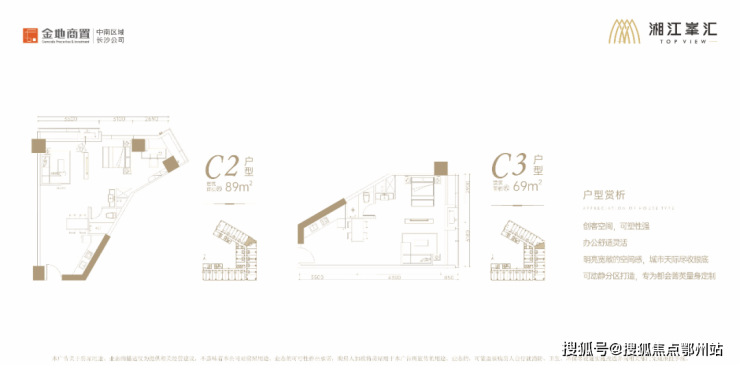【产品户型价值联想】 :A/B类面积段户型约37-47㎡,C类面积段户型约69-94㎡平层公寓,整层定制打通约1900㎡,全能型户型设计,高端临江酒店、美容SPA会所、培训机构、健康疗养中心、互联网公司、白领自住公寓、个人工作室等皆可打造,宜商宜住宜投资,人气核心不愁租