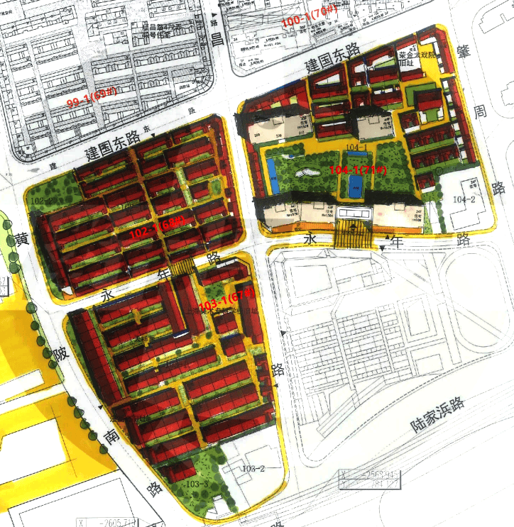 67街坊即103-01地块为商业、商墅和公服配套,68街坊即102-01地块为风貌住宅别墅、商墅和商业等,71街坊即104-01地块以高层/超高层住宅为主。