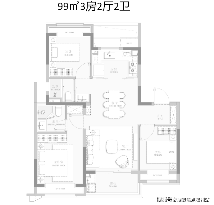 户型方正,多面采光,可以看做是在建面约99㎡户型上的升级,适合改善类购房人群, 主卧套房自带双台盆+浴缸,生活品质拉满。