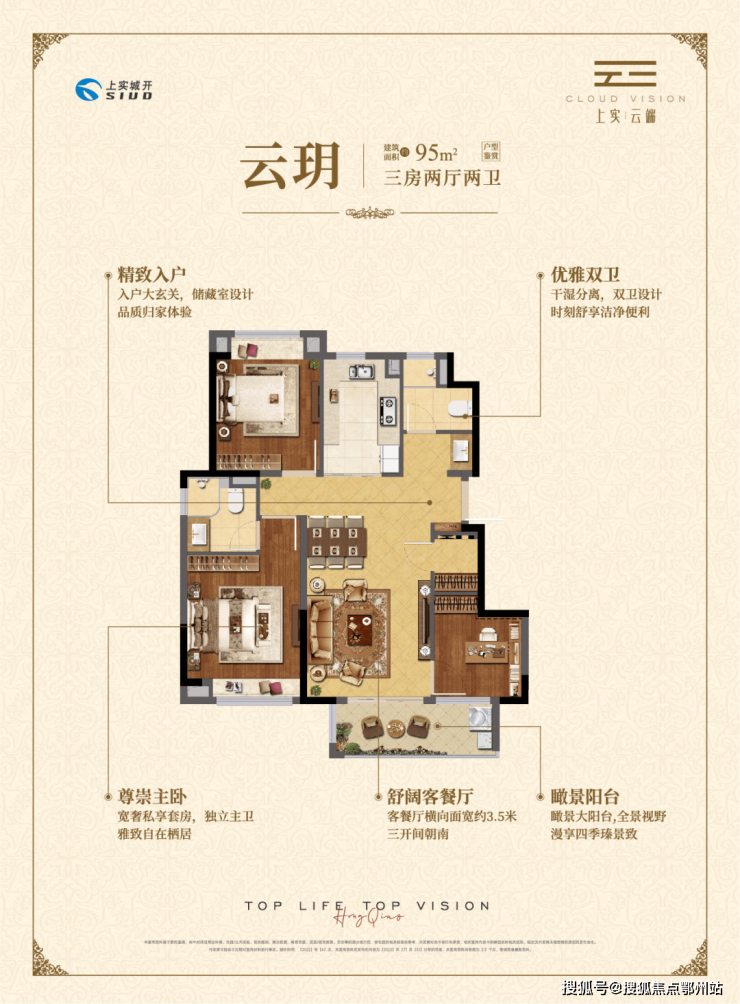 约95㎡三房两厅两卫,做到了 三开间朝南+瞰景大阳台+主卧套房设计+南北通透+卫生间干湿分离,该户型得房率和空间利用率都非常高。