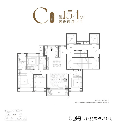 另外, 主卧小家化的套房设计、270度的南向瞰景阳台、四开间朝南的开阔尺度。