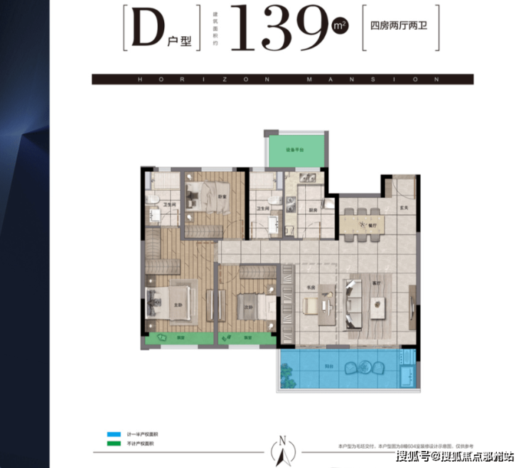建筑面积约139㎡户型,客餐通厅连接近6.7米南向双阳台,推窗即景,且带南向双飘窗,保证四开间朝南的宜居设计。