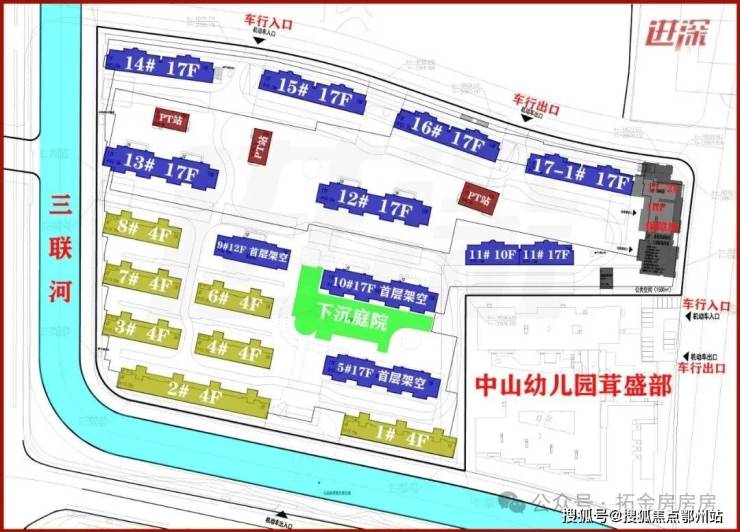 东侧和南侧被三联河包围,南侧预计会建桥梁,机动车辆可从此进入小区。