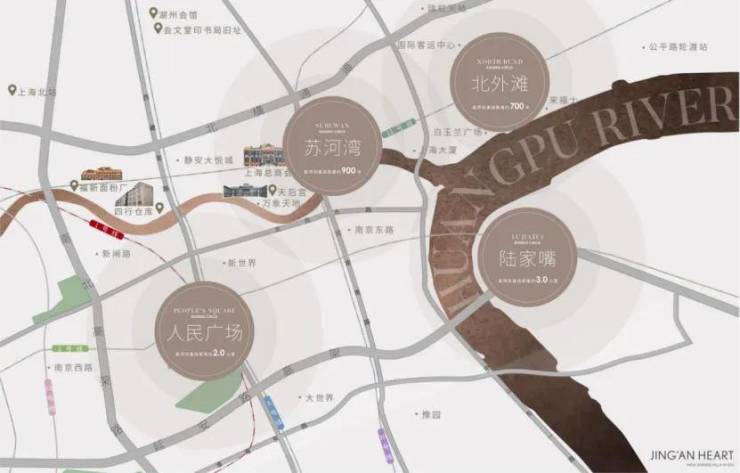 3、繁华之心: 外滩烫金三公里覆盖人民广场、外滩、陆家嘴等顶级商圈,同时苏河湾区域总商业开发体量接近100万㎡,共同形成CAZ商业黄金水岸,打造比肩新天地繁华生活。