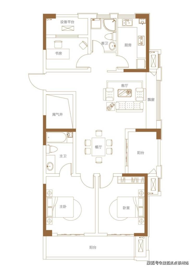 D户型继承了海波名苑一脉相承设计的用心,一样的双阳台和卧室。一样的北向多功房。而这个户型在前两个户型的基础上,保留了双阳台的同时在客厅的地方设置了宽广的飘窗,进一步加强了室内的采光和空气的流通。