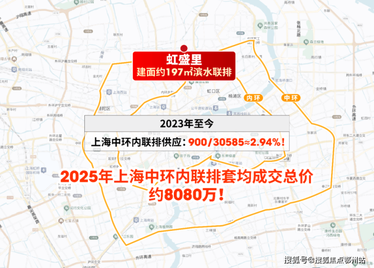 建面约197㎡滨水联排堪称中环稀缺藏品——2023年至今,中环内联排供应占比 不足3%,套均成交总价高达约 8080万(包含风貌)。 虹盛里的联排不仅填补了区域市场空白,总价更具亲和力。