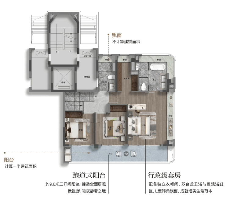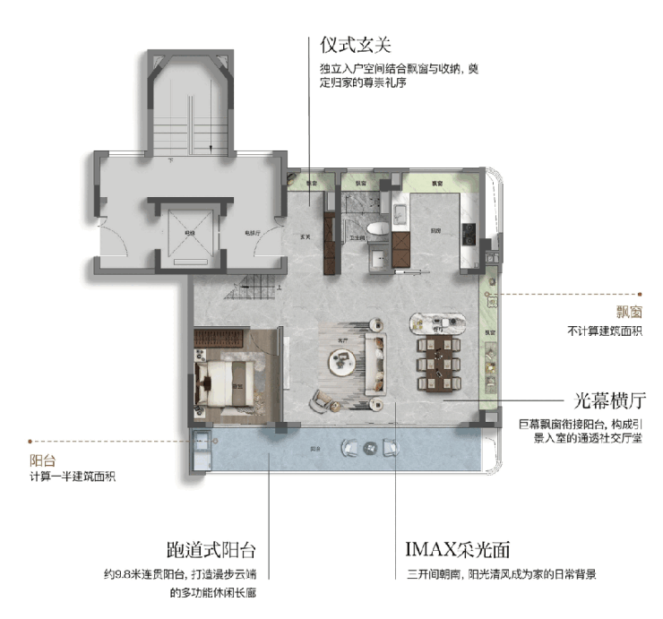 在细节打磨上,此户型亦不遗余力。 全屋飘窗全赠送约9.8㎡,配合约7.2㎡的大阳台(计一半建筑面积) 不仅增加了实际使用面积,更在视觉上提升了空间的通透感。