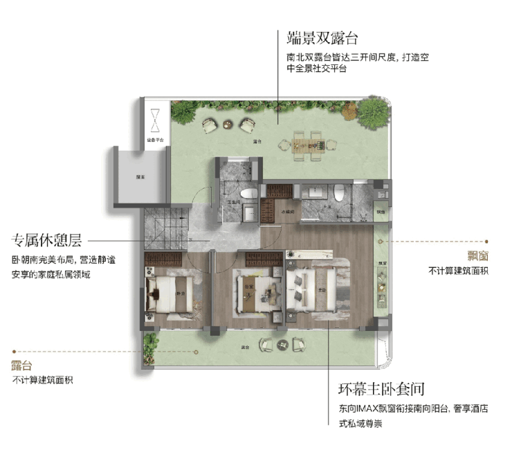 二层专属静区规划尤为出色, 环幕主卧套间 配备独立卫浴与衣帽间,营造出酒店式居住体验。最令人惊叹的是南北双露台的配置,为盆栽园艺、星空茶室、阅读角落等个性化生活场景提供了无限可能。