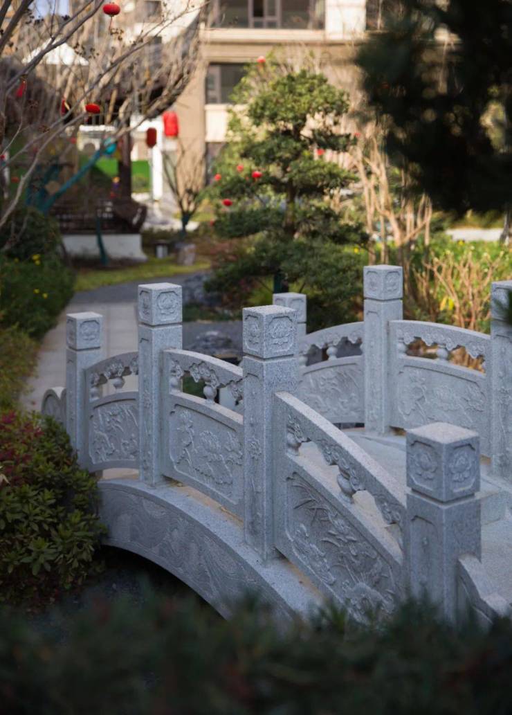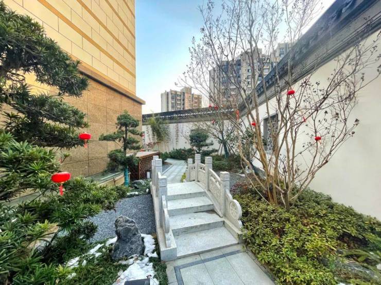 来到中心景观处,视野里小桥流水、亭台楼阁互相交融,假山、花木、廊桥共谱美景,几块山石前簇后拥。