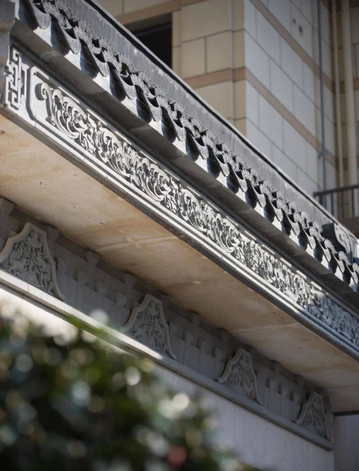 走近细看,入户大门还融入了不少中式建筑巧思,纹理雕刻细致入微,处处都彰显着不凡的气度。