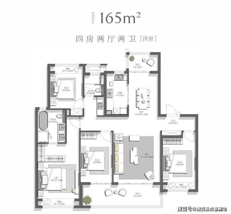 洋房165㎡户型,同样的4开间朝南,优化了厨房和餐厅的布局,南北通风更通透,餐厅的采光也更好。