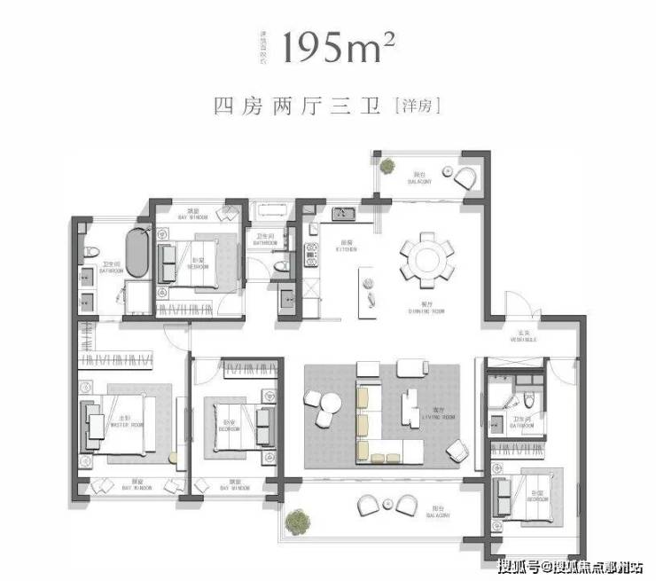 195㎡洋房可以说是项目最好的户型。 大横厅,双套房,南北通透,4开间朝南,南北双阳台,几乎囊括了市面上用户最喜欢的设计。