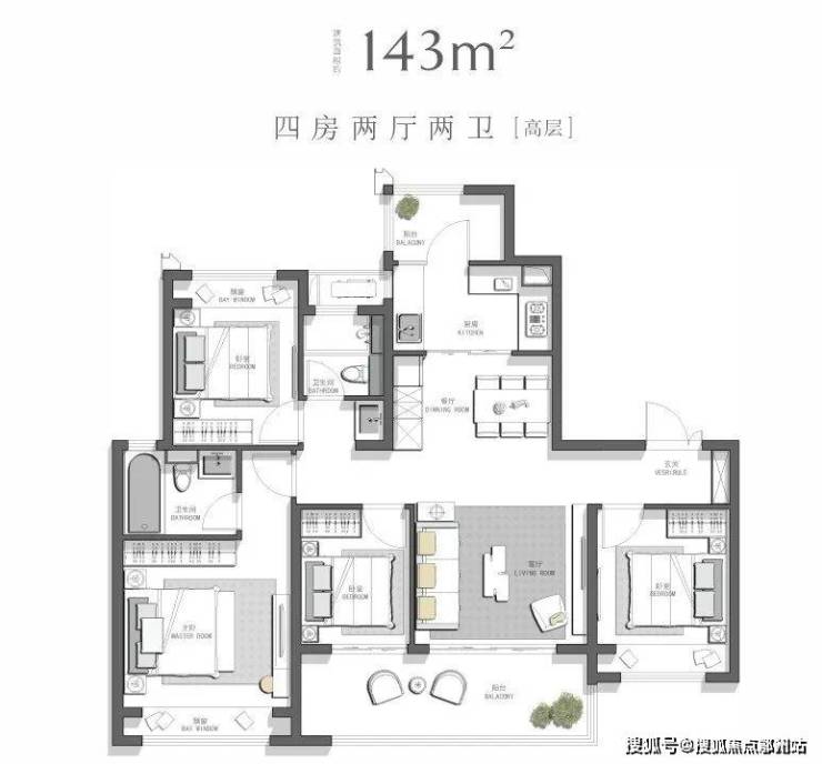 143m²户型为两梯两户,四房两厅两卫,四开间朝南。南北双阳台,南向为双联阳台,长约6.35米,设计中规中矩。