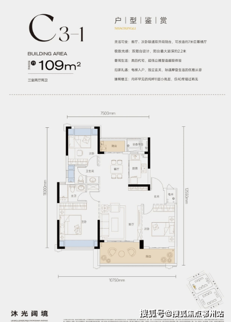 独立玄关入户,私密性与仪式感十足。三开间面宽可达约10.75m,1厅2卧直面阳光,采光性和通透度都非常优越;双阳台+四飘窗设计,不仅空间尺度更大,还实现了板式通风对流布局让空间变得舒适、自在;阳台最大进深达到约2.2m,承载了诗意生活的所有想象。