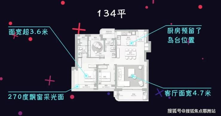 134平三房户型,整体空间感更强,客厅面宽超4.7米,厨房也预留了岛台位置,主卧做得比较有亮点,面宽预计超3.6米,并配置了270度飘窗采光面。