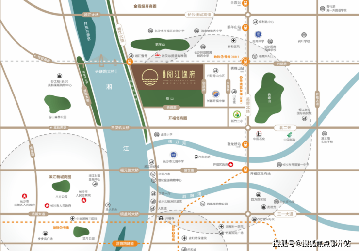 项目位于湘江大道与兴联路交汇处,西侧紧临湘江,占据优越的江岸地理位置,近享开福城区成熟配套。