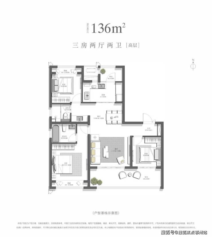 【建面136㎡3居】540万-分布于5号楼 ,2梯2户,层高3.00米,总楼层23F