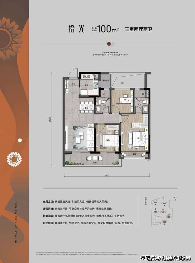 建面约100㎡户型,三开间朝南,南向开间约为9.6米,南向双联大阳台,兼空间尺度感和实用性于一身,一家三口的必摇户型。