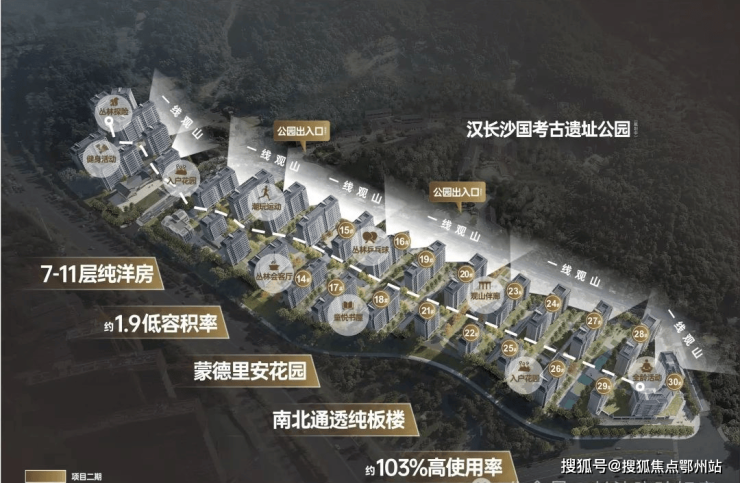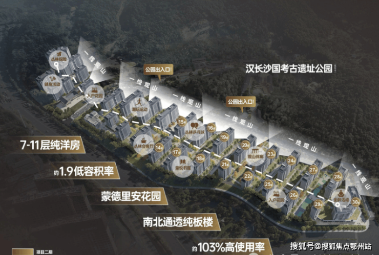 公园洋房 :拥约217公顷汉代历史文脉--汉长沙国考古遗址公园,揽约6400亩谷山森林秘境,生态环境得天独厚,将公园美景与社区生活无缝融合,塑造“长在公园上的洋房”。