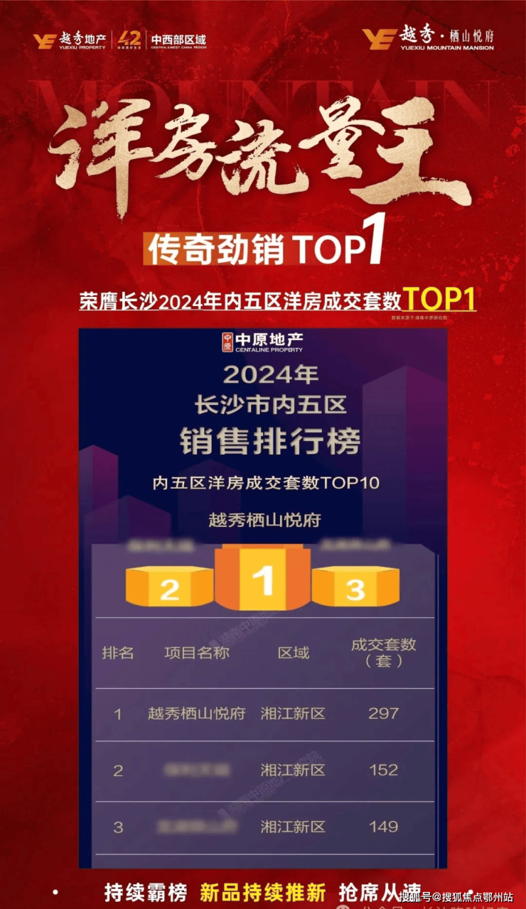 根据湖南中原研究院公布的数据显示,越秀栖山悦府荣膺长沙2024年内五区洋房成交套数TOP1,流量王者,持续霸屏,好房当燃不让!