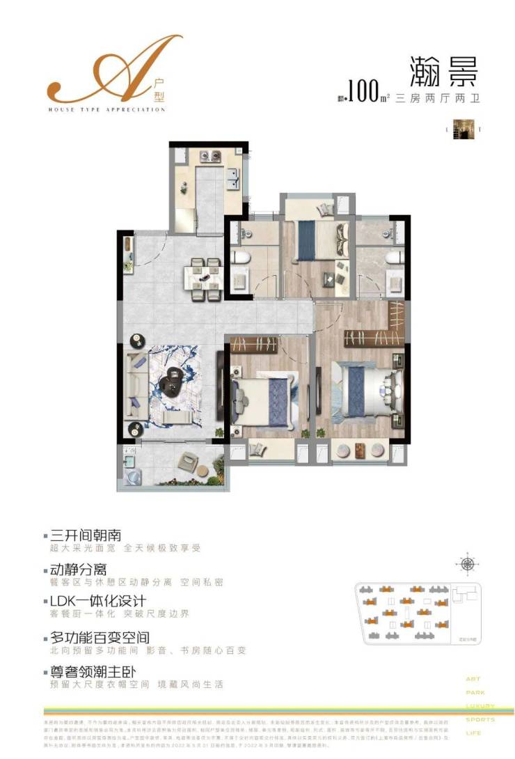项目约100㎡3房2卫 的户型把实用性做到了极致,总价虽低,但能满足业主从二人世界到二胎生活的全生命周期需求。
