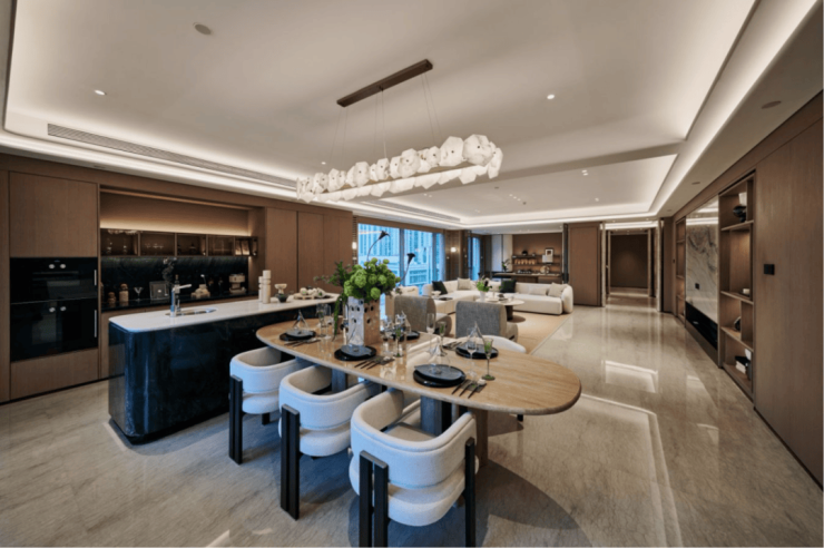 中间套的客餐厅更是达到约100㎡,一张12人的大圆桌也有充足的空间优雅转身。周末约上好友来聚会,给主人赚够了颜面。