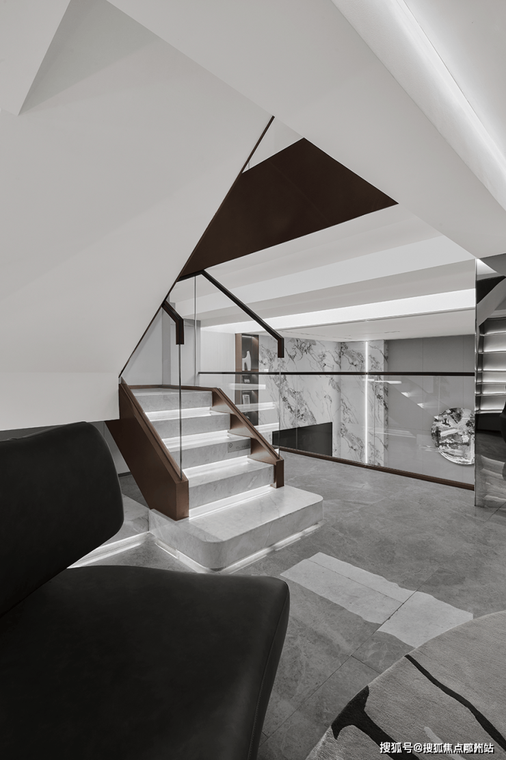 以及对空间节奏的把控!沿梯下行楼梯利用灯光,呈现出轻盈的悬浮感,夹层作为阅读空间延续了整体色调,在黑白之中求得平衡 不张扬 也不喧闹,弧形沙发和圆形茶几带来的包围感!
