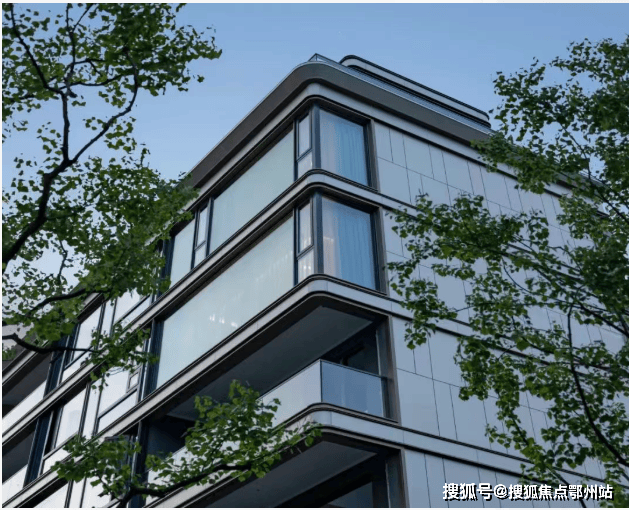 建筑融合东方官帽元素与现代简约风格,铝板+石材外立面