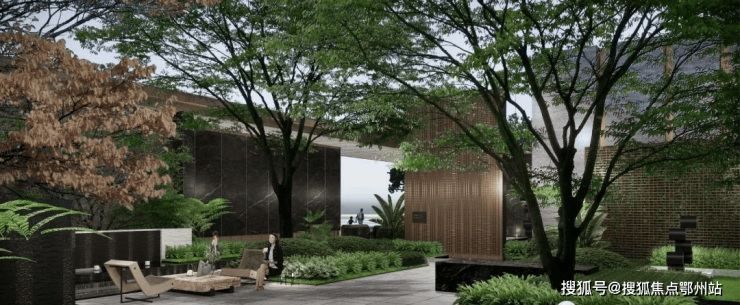 【二境|和合水院】灵感源自曼谷四季酒店,景墙与水景贯穿,利用溪流、光影、亭台、连廊、名木五种元素,营造花园式门庭,中心会客厅、休闲平台、林间栈道围合草坪,处处景致动人。