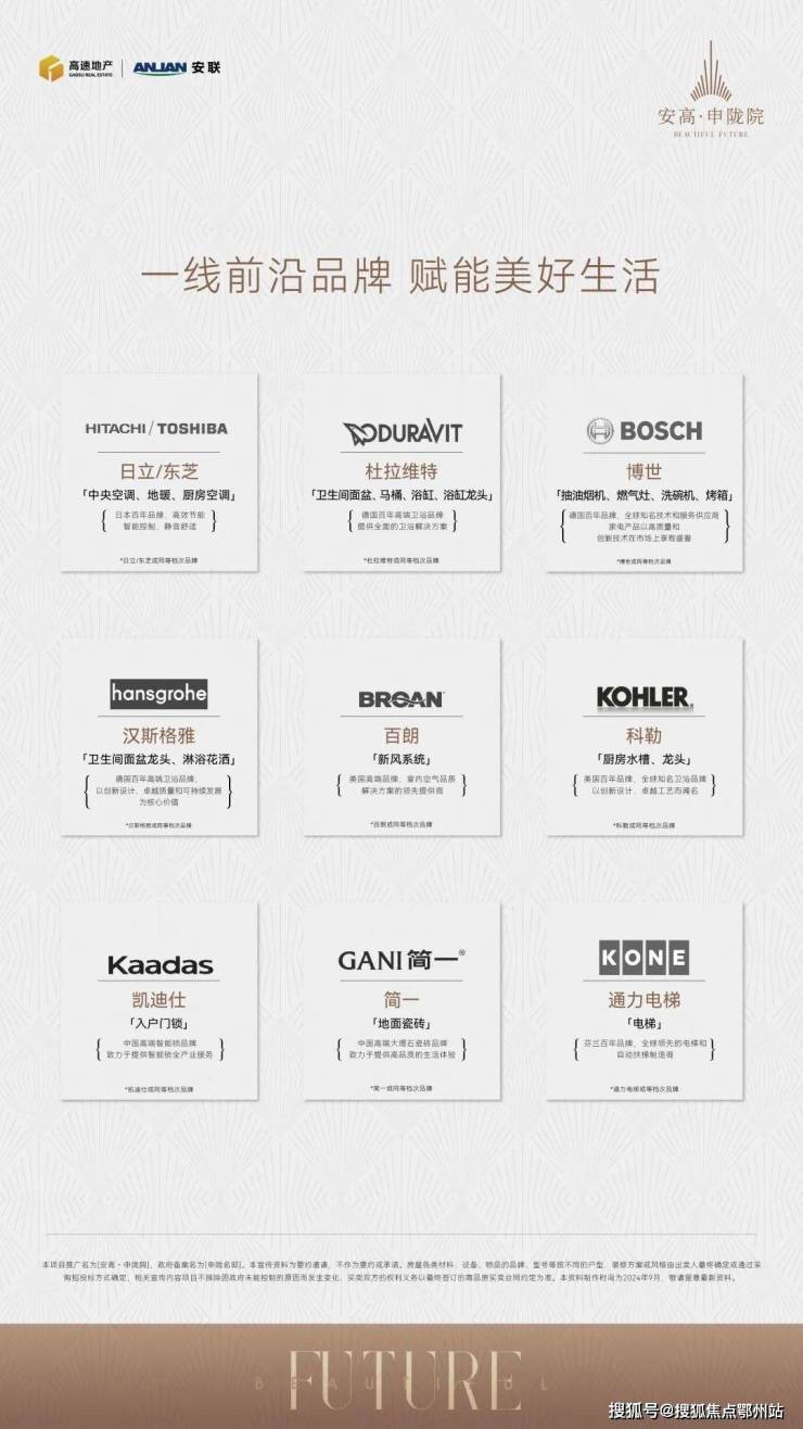 精选国际一线品牌:全屋配置 简一瓷砖、 百朗新风系统(或同等品牌); 日立或东芝(或同等品牌) 中央空调、地暖以及厨房空调;