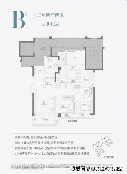 在同步继承百平户型优势的基础上,针对小户型空间有限的客观现实,做出了对应的设计。三分离卫生间,不仅将“一卫”的空间还给了其它房间,更可容纳一家三口分别使用不同功能区,增加空间利用率。三卧室带飘窗,提升使用面积。