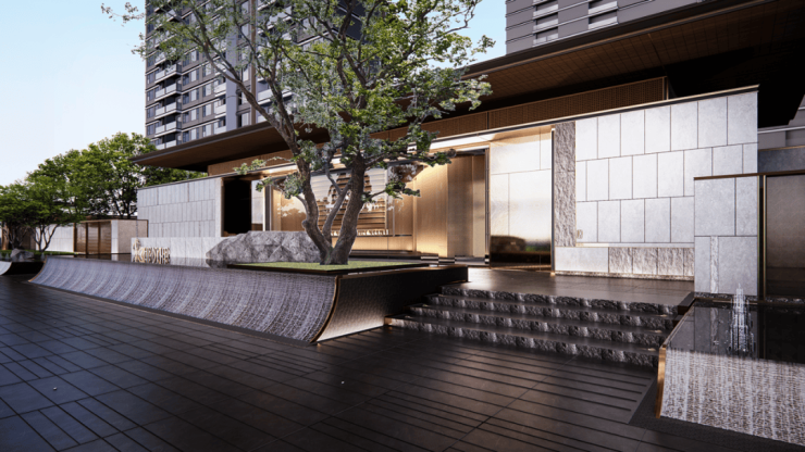 一园三堂的归家动线 ,象征着东方人文礼序。建筑风格造型,灵感源自金镶玉设计,提取其“曲”的形和白金配色应用到塔楼立面上,彰显项目的温和雅丽与尊贵典雅。