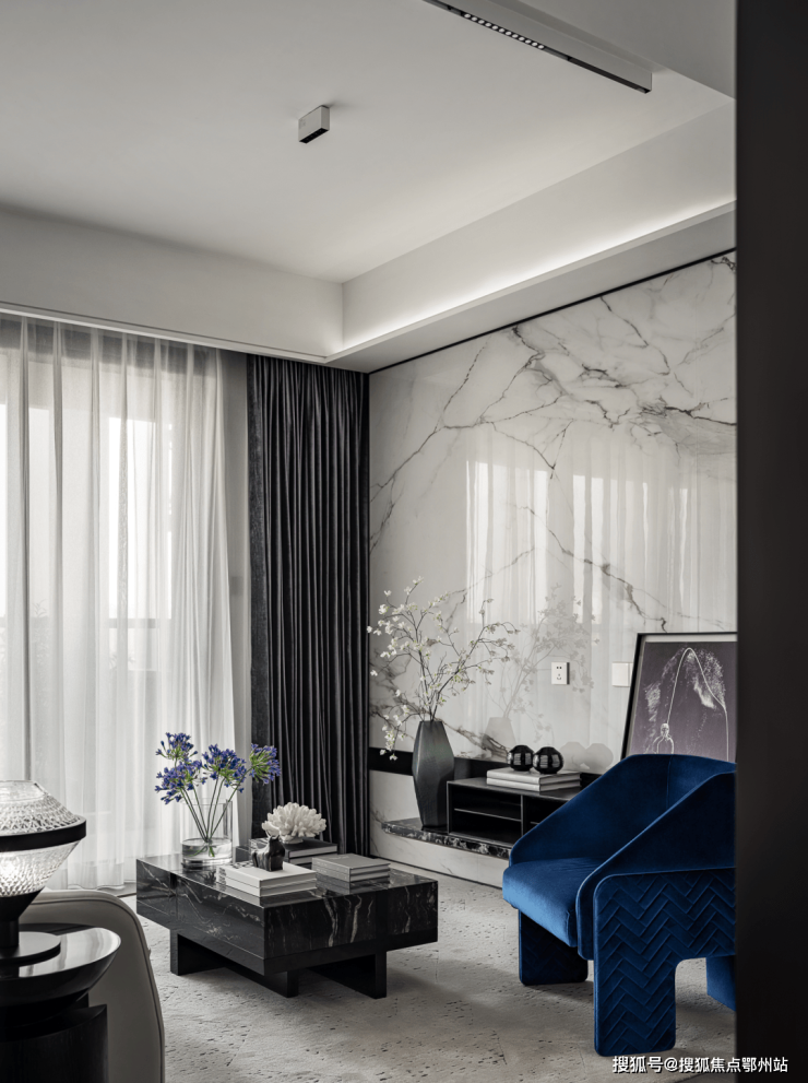 同时, 社区内部景观打造了大面积的叠级水景,搭配普拉达绿大理石和浪淘沙石材, 呈现整体空间的隐奢基调。