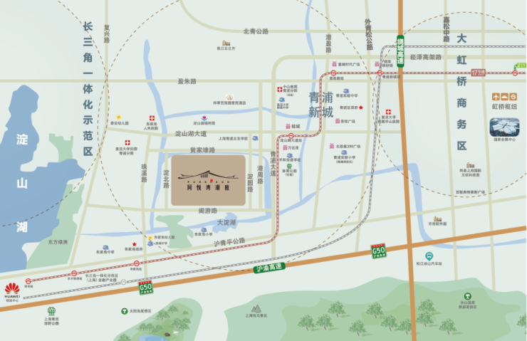 项目与17号线淀山湖大道站直线距离约2.5公里,通过17号线可直达虹桥商务区,并且能无缝换乘2/10号线,快速接驳上海市中心。