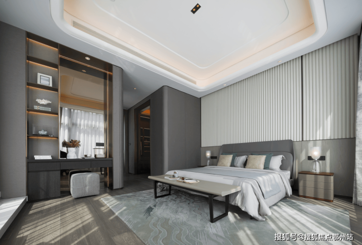 卧室的设计,采用高级的暖灰色调,深色原木为介质,塑造出沉稳的气质与空间的张力,更在视觉上丰富了景深。极具意蕴的装饰画与墙面装饰,共同营造出温馨舒适的居住氛围,简约的书桌前放置着一张皮质的扶手椅,让主人可以舒适惬意的度过午后时光。