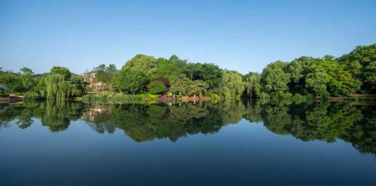 早晨的闹钟被鸟鸣替代,推窗时约19米台地正承接第一缕阳光。香樟树将晨光筛成流动的金箔,洒在约2.2万平的水域之上。