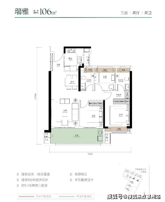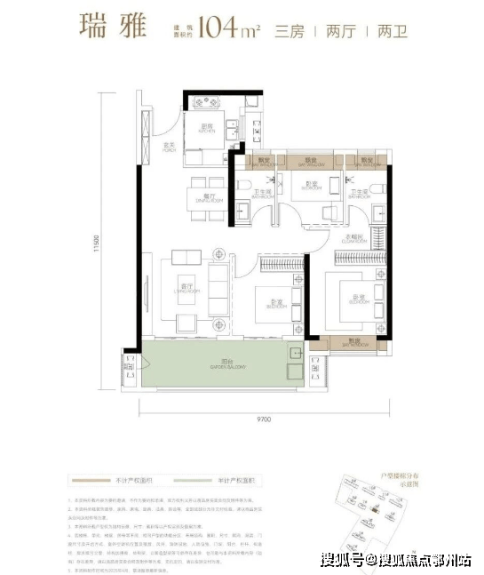 梯户比:1T2户(3个单元),得房率:95%