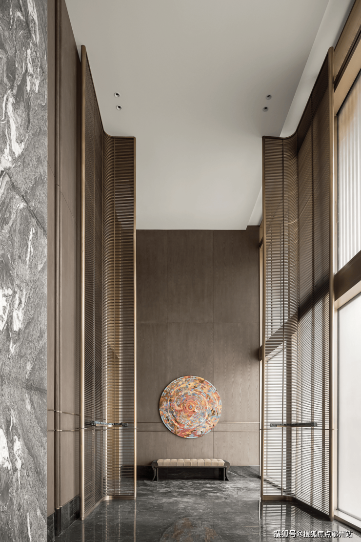 步入玄关处,以一整面森林绿大理石背景墙做视觉隔断,搭配两侧艺术造型的皮革硬包,观感上既没有大面木质隔断的厚重,又不失新中式应有的华丽。当然,木材在新中式产品打造过程中依旧不可或缺,因此缦云仍在玄关处打造了大量木饰面,并采用海棠花腰线设计来提升饰面美感。